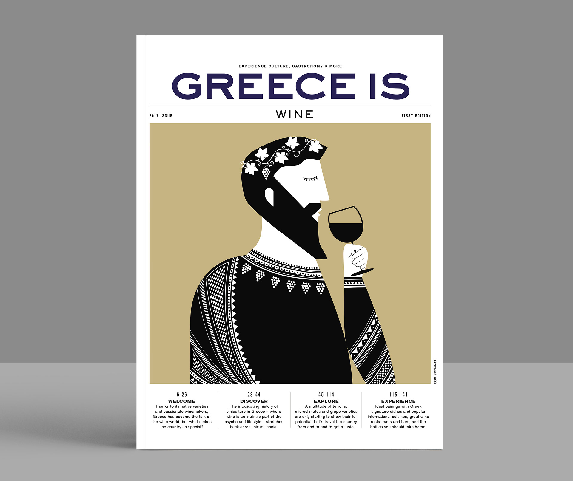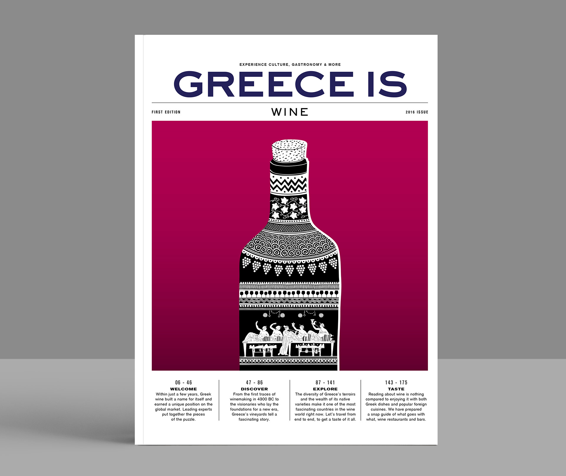 Wine as part of Greek culture from ancient times to today. I designed a cover for an issue of “Greece Is” magazine dedicated to wine. Elements of ancient Greek designs and relating to viniculture were used.
